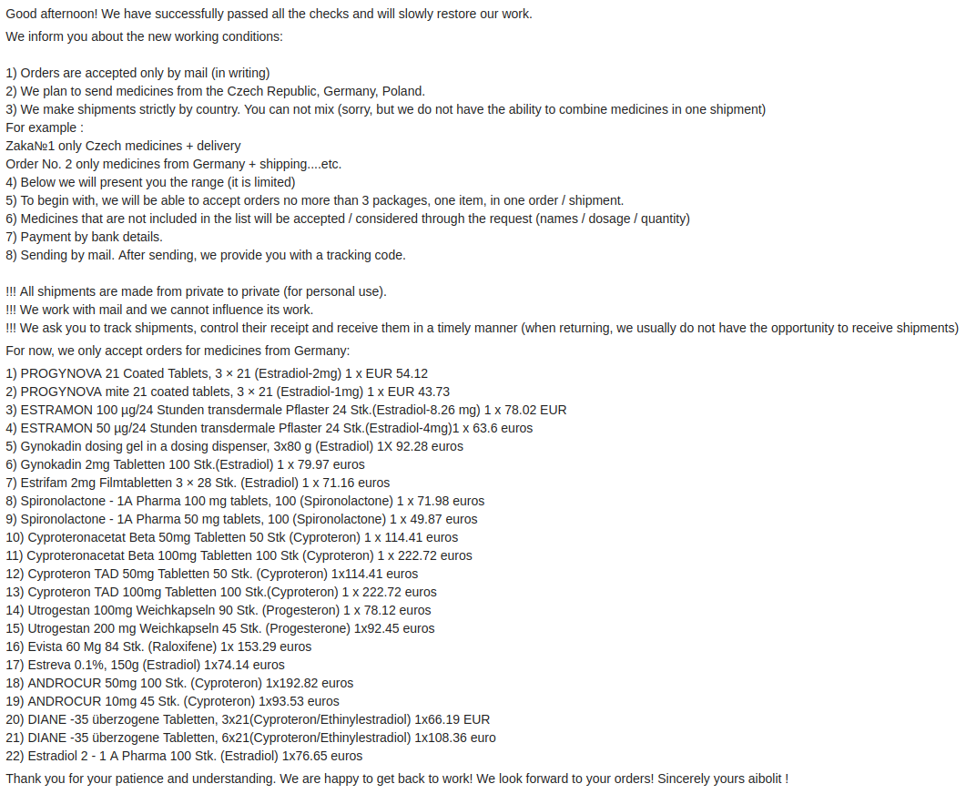 | RU-Pills/hrt-cafe | Russia | Regular HRT + GnRHs, LHRHs, SERMs. | ||